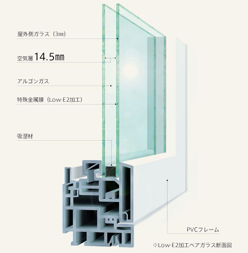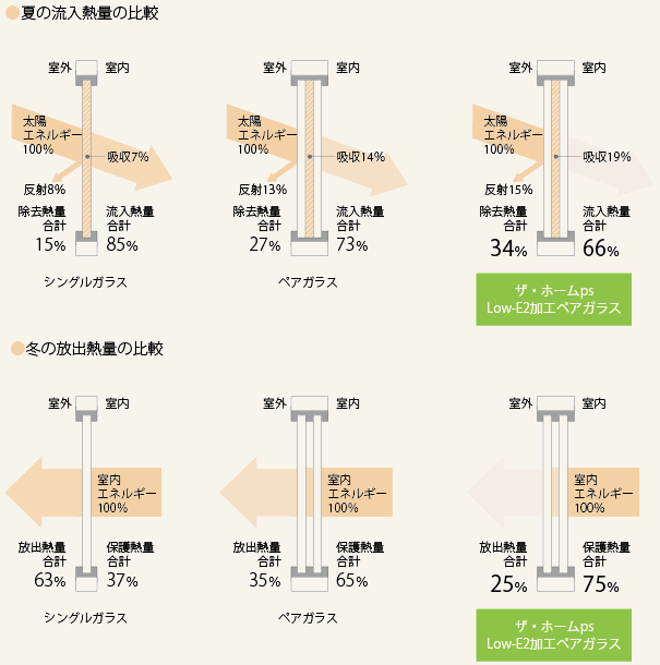 ザ・ホームpsでは断熱性の高い樹脂製サッシと、Low-E2加工+アルゴンガス入り複層ガラスを標準装備しています。