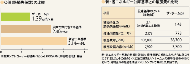 高断熱・高気密住宅の成果は、Q値(熱損失係数)という省エネ性能を表わす数値で比較することができます。Q値が低いほど断熱性が高いこと示しますが、カナダの厳しい断熱水準を取り入れたザ・ホームpsのQ値は公庫基準値のほぼ半分と極めて低く、エネルギー算出例においても圧倒的な省エネ性能を表わしています。