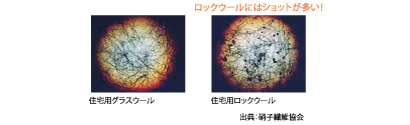 グラスウールは繊維の1本1本の太さが均一で繊維が長く、弾力性にも富んでいます。ロックウールは、繊維が短くもろいので、圧縮した場合に復元しにくい素材です。さらに、繊維化されていないショット(ダマのこと)が混ざっているため手ざわりが悪くなります。